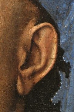 Want toen ik nauwkeurig het schilderij ' man met blauwe kaproen' bestudeerde en vooral naar een detail wat niet op de voorgrond staat zoals bijvoorbeeld het oor