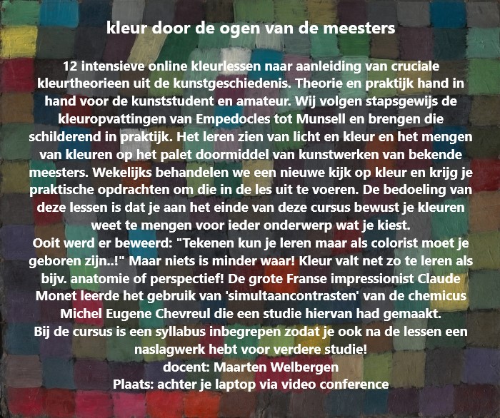 Een cursuspakket over het gebruik van kleur en historisch overzicht van kleurtheorieen. Vanaf de oude grieken zijn er verschillende opvattingen geweest over kleur en licht. Deze cursus gaat diep in op deze theorieen met voorbeelden uit de oude en recente kunstgeschiedenis tezamen met praktische oefeningen. Het is bedoeld voor de kunststudent en de goede amateur om meer over kleur te begrijpen en praktisch toe te passen. De cursus bestaat uit 12 videolessen die iedere week gehouden worden van 19:30 tot 21:00 uur. Bij de cursus is een syllabus inbegrepen die iedere week wordt toegestuurd.. .